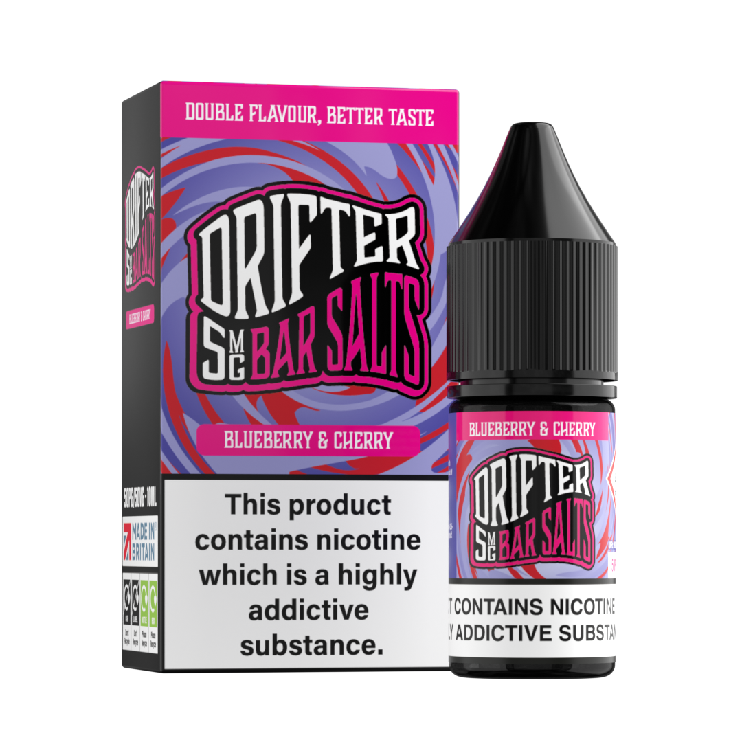 The Drifter Bar Salt Blueberry Cherry premium nicotine salt e-liquid is expertly crafted for a smooth, satisfying vaping experience. Offering a unique blend of bold, juicy fruits, refreshing menthol twists, and nostalgic sweet notes, delivering crisp, clean, and refreshingly smooth vapour perfect for everyday use.